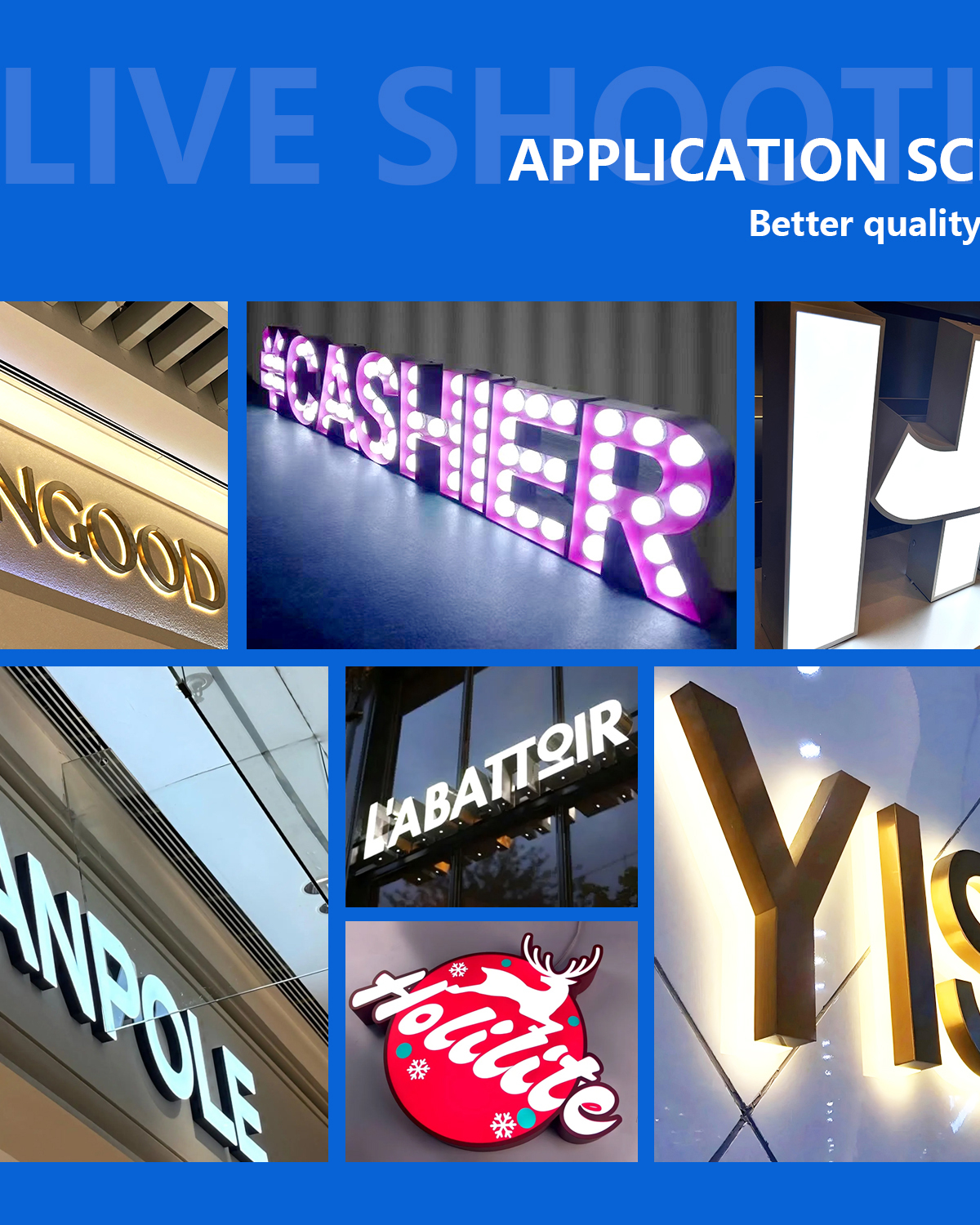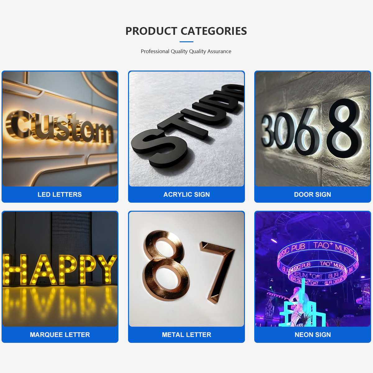 Productos principales:Letrero de Iluminación Frontal LED, letrero retroiluminado LED, mini letrero acrílico LED, letrero de neón, letrero de metal